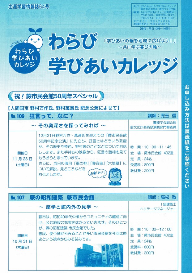 ■わらび学びあいカレッジでは、開催する講座内容についてを「生涯学習情報誌」として発行し無料配布しています。9月1日発行の蕨市役所発行の広報誌と一緒に「生涯学習情報誌64号」が蕨市内の全軒に配布されました。その他にも市内各所に配布されており、ご自由にご覧いただけます。